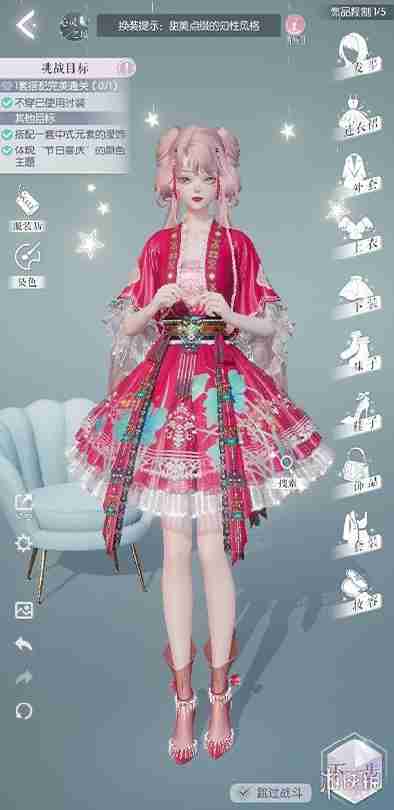 3/4星即可过关,红色:染芳菲尽,这里枫华白露套做完了可以用旗袍染色(制作色卡),这里没做完只能染池子里的这件,挨次是先满足中式的标签,再加属性标签的衣服,最后染色。