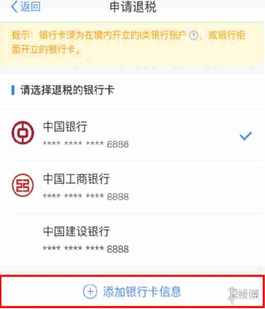 点击【申请退税】后,纳税人需选择退税银行卡。如您已添加过银行卡,系统将自动带出已填银行卡信息。如需新增,点击【添加银行卡信息】—【确定】。