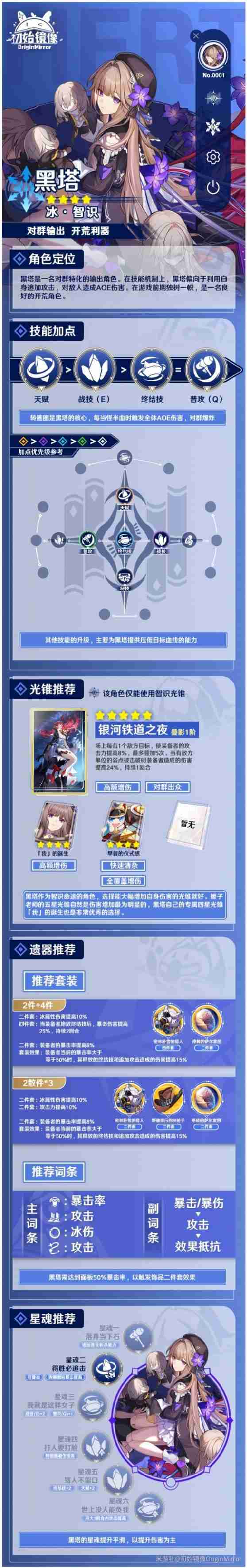 角色一图流内容包罗:角色定位、技能加点优先级、光锥保举、遗器保举、星魂保举和组队保举,用心看完一图流,大家就可以对黑塔小姐的玩法有一个大致的思路啦。