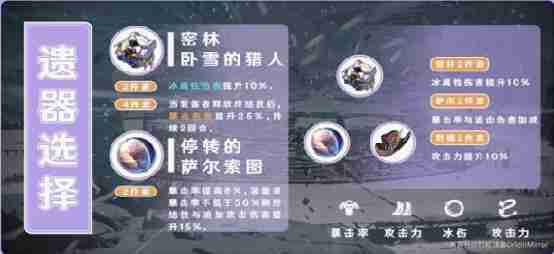 黑塔的遗器最优选择为【密林卧雪的猎人】四件套加【停转的萨尔索图】二件套,这套组合可以给黑塔带来冰伤加成与双暴属性提升,需要注重的是黑塔的面板暴击率需要达到50%以上来触发【停转的萨尔索图】的二件套效果。