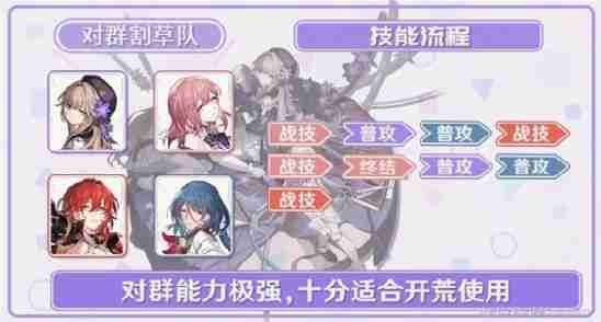 黑塔 姬子 艾丝妲 娜塔莎,这套阵容适用于对群割草的战斗环境,由艾丝妲提供攻打力增益和速度增益,姬子和黑塔双对群在处理复数敌人时战斗效率极高,可以快速完毕战斗。