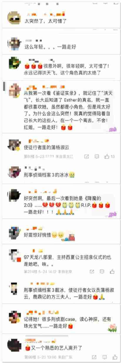 噩耗传来后,TVB对她离世深表可惜,并向其家人致以深切慰问。香港知名艺人马浚伟在TVB社交媒体留言“RIP Esther,静待他日再相见”。网友们留言表示“很多港剧都见过她”“又是一个认识的老面孔,一路走好”。