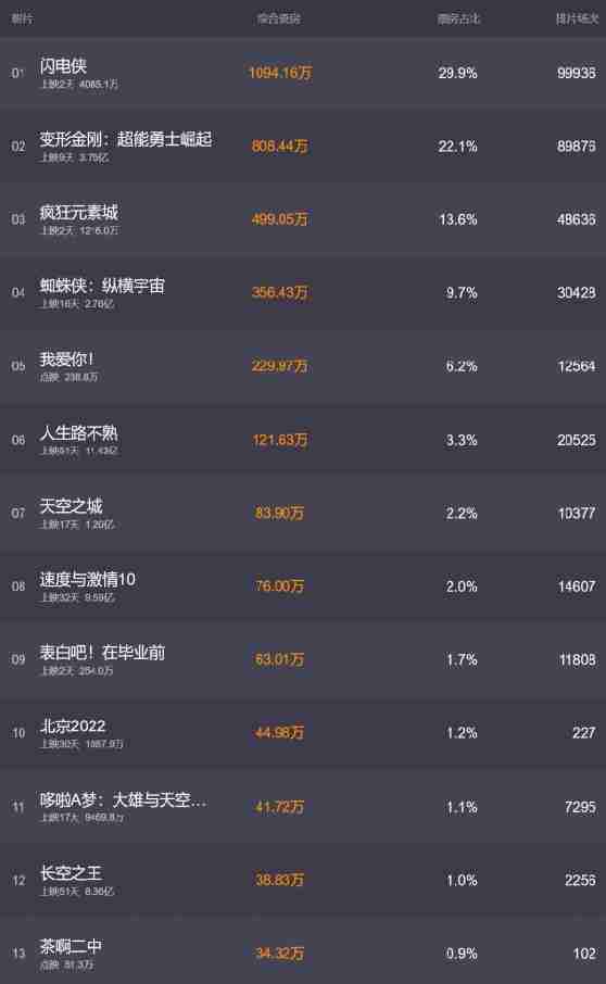1、闪电侠:4085.1万(1094.2万)【上映2天】