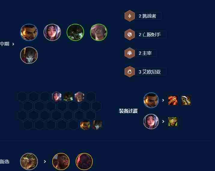 2阶段以3艾欧为中央,补沃里克开2主宰2挑战,后排找个长手AD单位带装备,优选2星莎弥拉>2星烬>2星崔丝塔娜。
