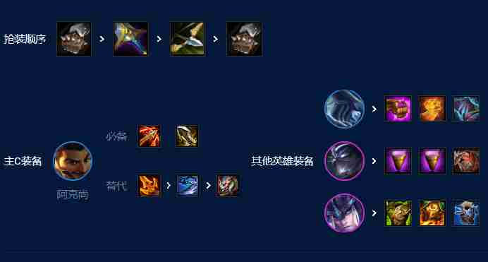 主C阿克尚卢安娜的飓风必备,第二件优选无尽之刃,第三件锋利之剑=巨人捕手>泰坦的果断=第二件卢安娜的飓风副C丽桑卓珠光护手、正义之手、莫雷洛秘典辅助慎1-2能量圣杯再补件防装全部由腰带合成的肉装给瑟庄妮,有守护者之誓也给瑟庄妮上一个。