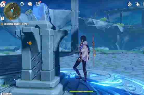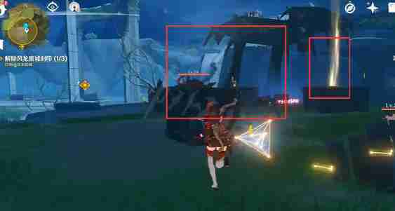 1、从风龙废墟的顶部飞下,可以看到有短短的光柱,所以我们直接飞到光柱处,将这两个菱形机关部件拿到。