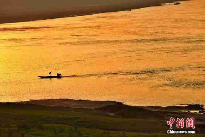 资料图:初秋时节黄昏时分打渔人划船在长江中。石伟 摄