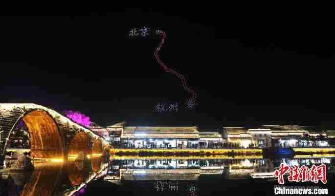 无人机在中国大运河畔的杭州塘栖古镇上空进行主题演出。(资料图) 王刚 摄