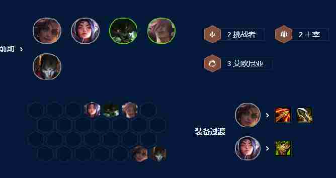 2阶段以3艾欧为中央,补沃里克开2主宰2挑战,后排找个长手AD单位带装备,优选2星莎弥拉>2星烬>2星崔丝塔娜。