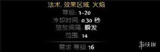 2、正火的技能等级是1到20级,基础冷却时间是0.30秒,而且是顺发,基础范围是14,玩家需要16级才干获得这个技能。
